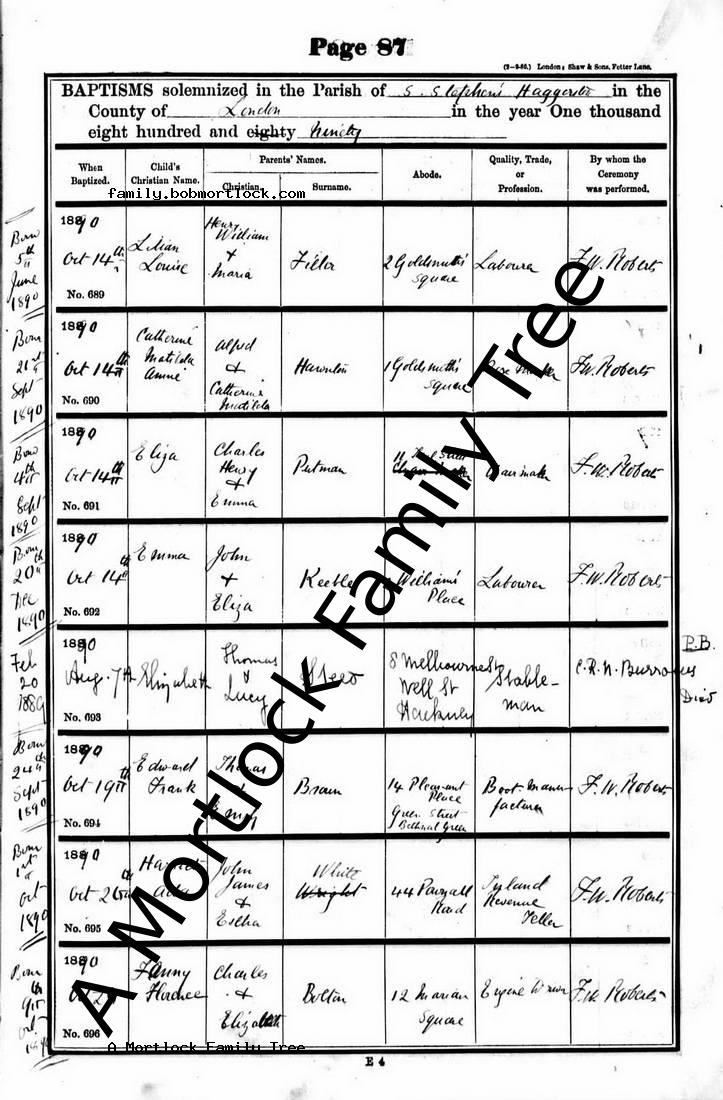 | Baptism | 14 October 1890 (Age 23 days) Haggerston, E London, England Address: St Stephen |