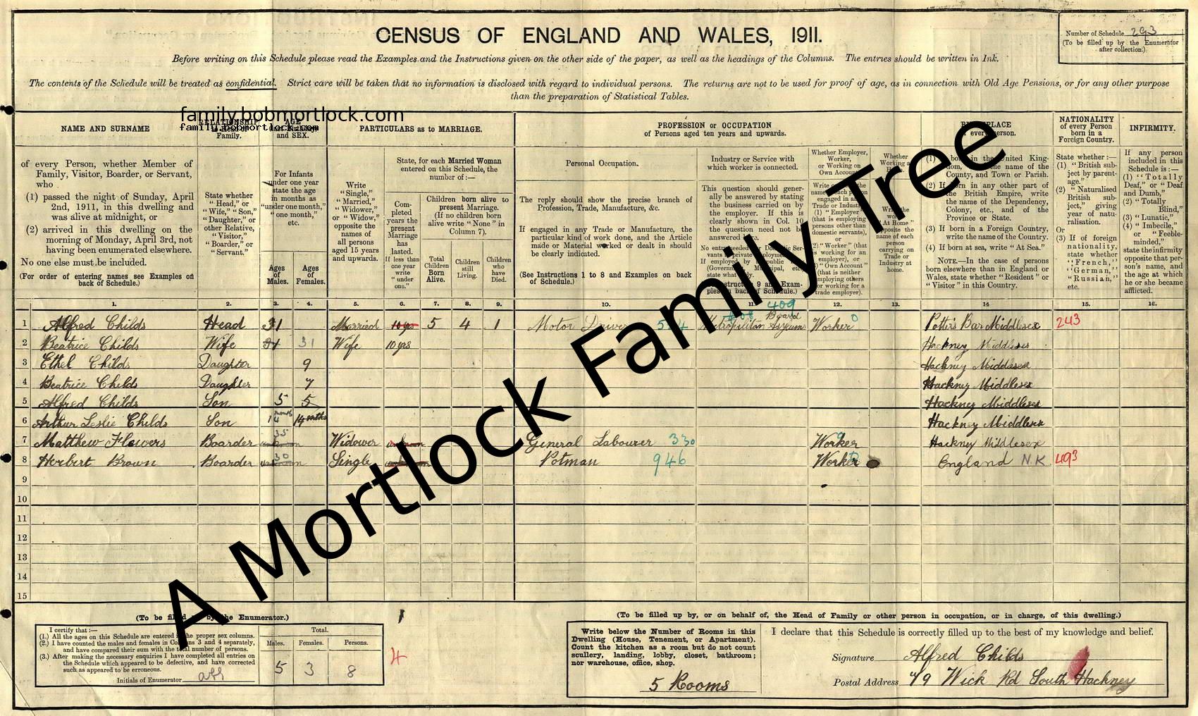 | Census | 2 April 1911 (Age 5) Hackney, E London, England Address: 79 Wick Road