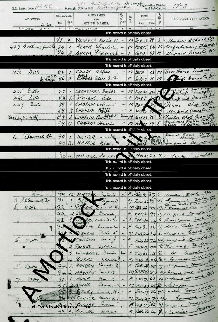 | Census | 29 September 1939 (Age 33) Bethnal Green, E London, England Address: 441 Bethnal Green Road [The Sun Tavern]