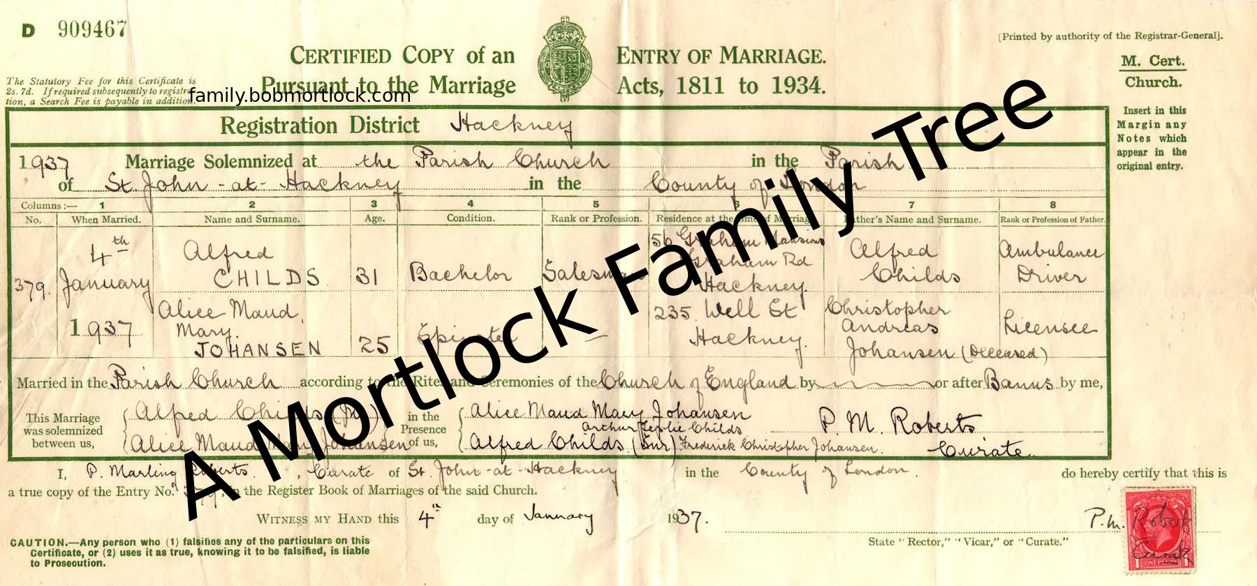 | Civil Marriage | Alice Maud Mary JOHANSEN - View family 4 January 1937 (Age 31) Bethnal Green, E London, England |
