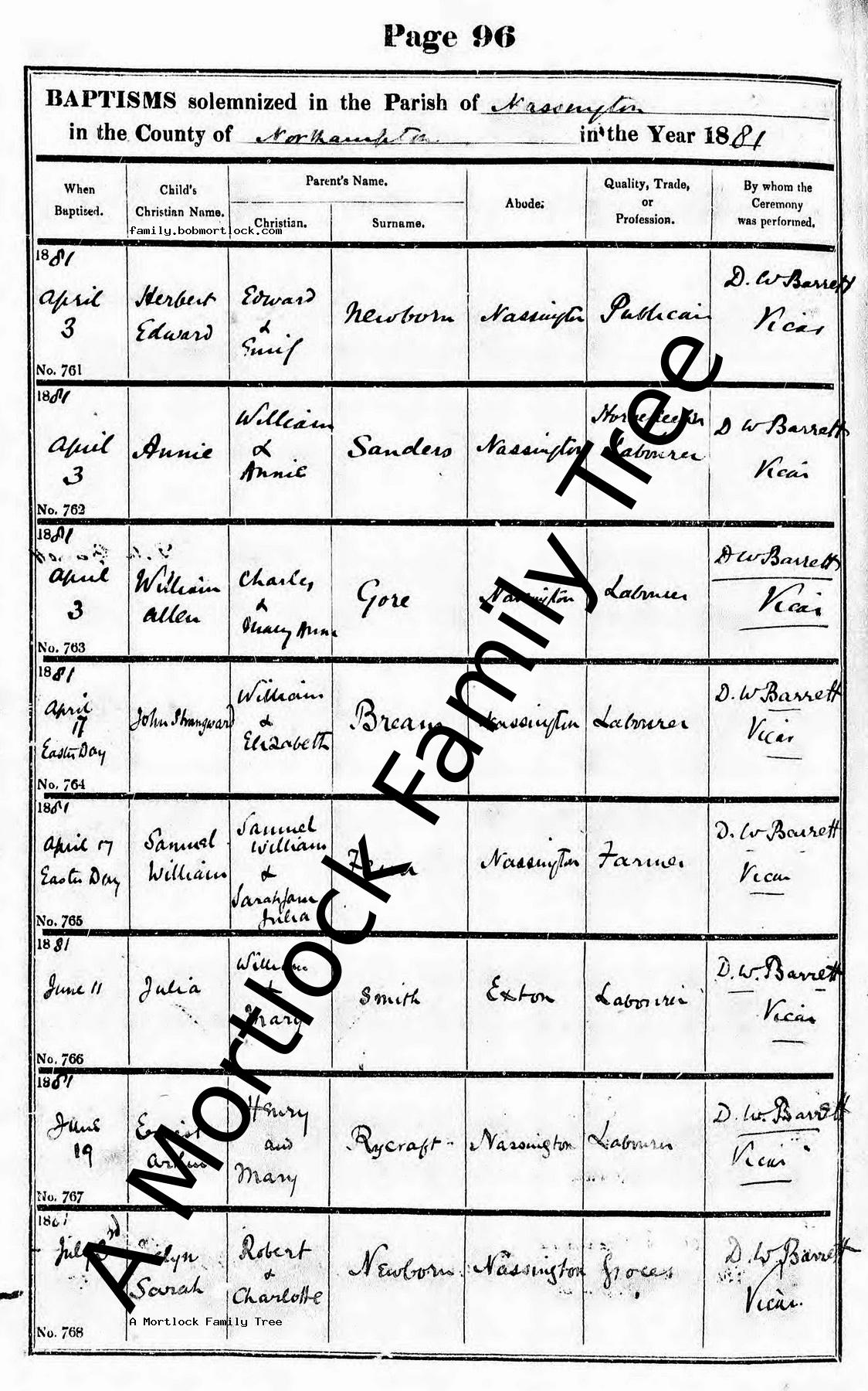 | Baptism | 17 April 1881 (Age 24 days) Nassington, Northamptonshire, England Address: The Parish Church |