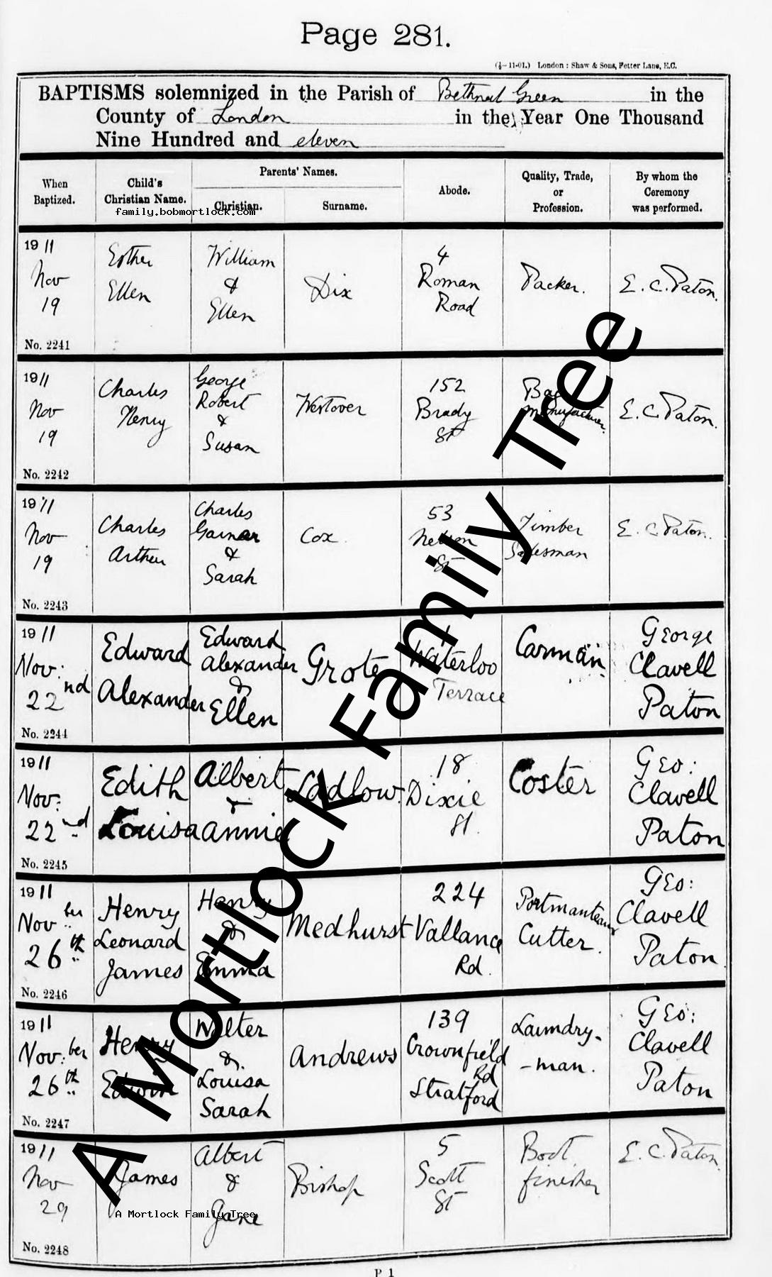 | Baptism | 26 November 1911 Bethnal Green, E London, England Address: St Andrew, Viaduct Street |
