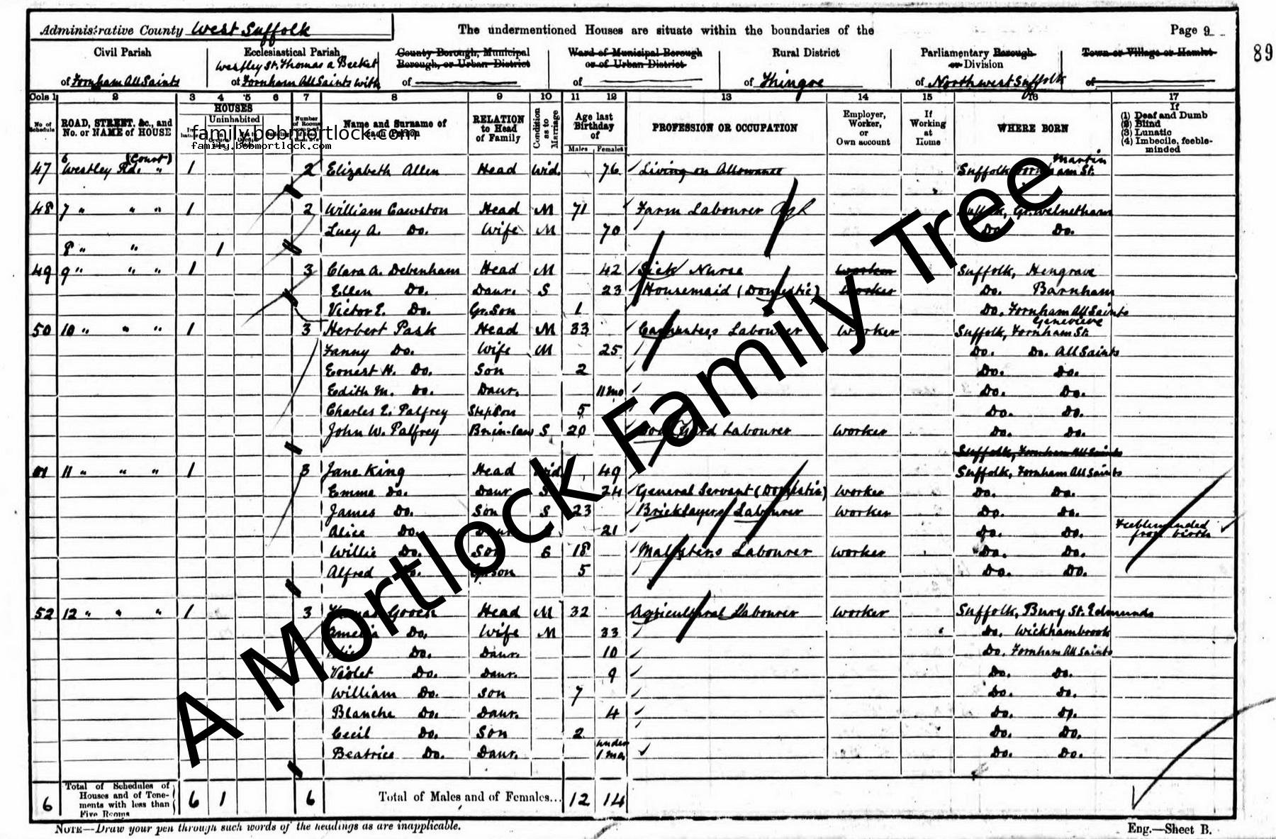 | Census | 31 March 1901 (Age 9) Fornham All Saints, Suffolk, England Address: 12 Greatly Road