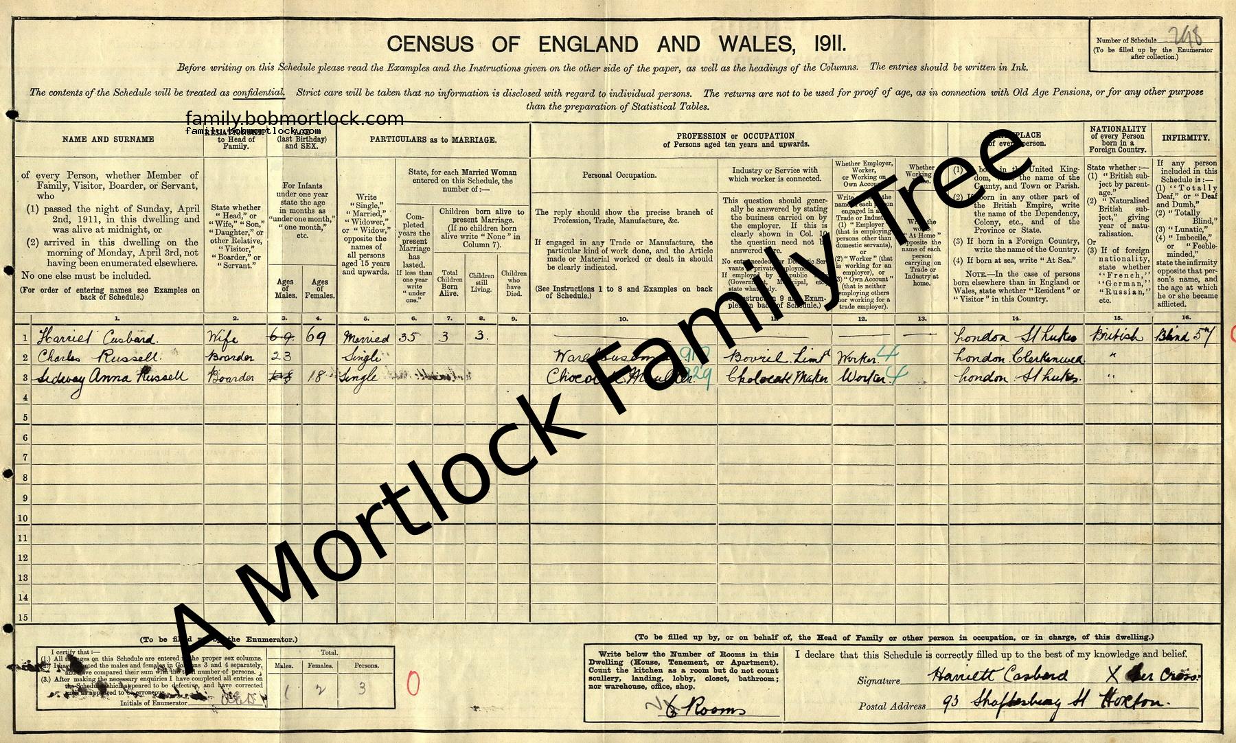 | Census | 2 April 1911 (Age 69) Shoreditch, E London, England Address: 93 Shaftesbury Street, Hoxton