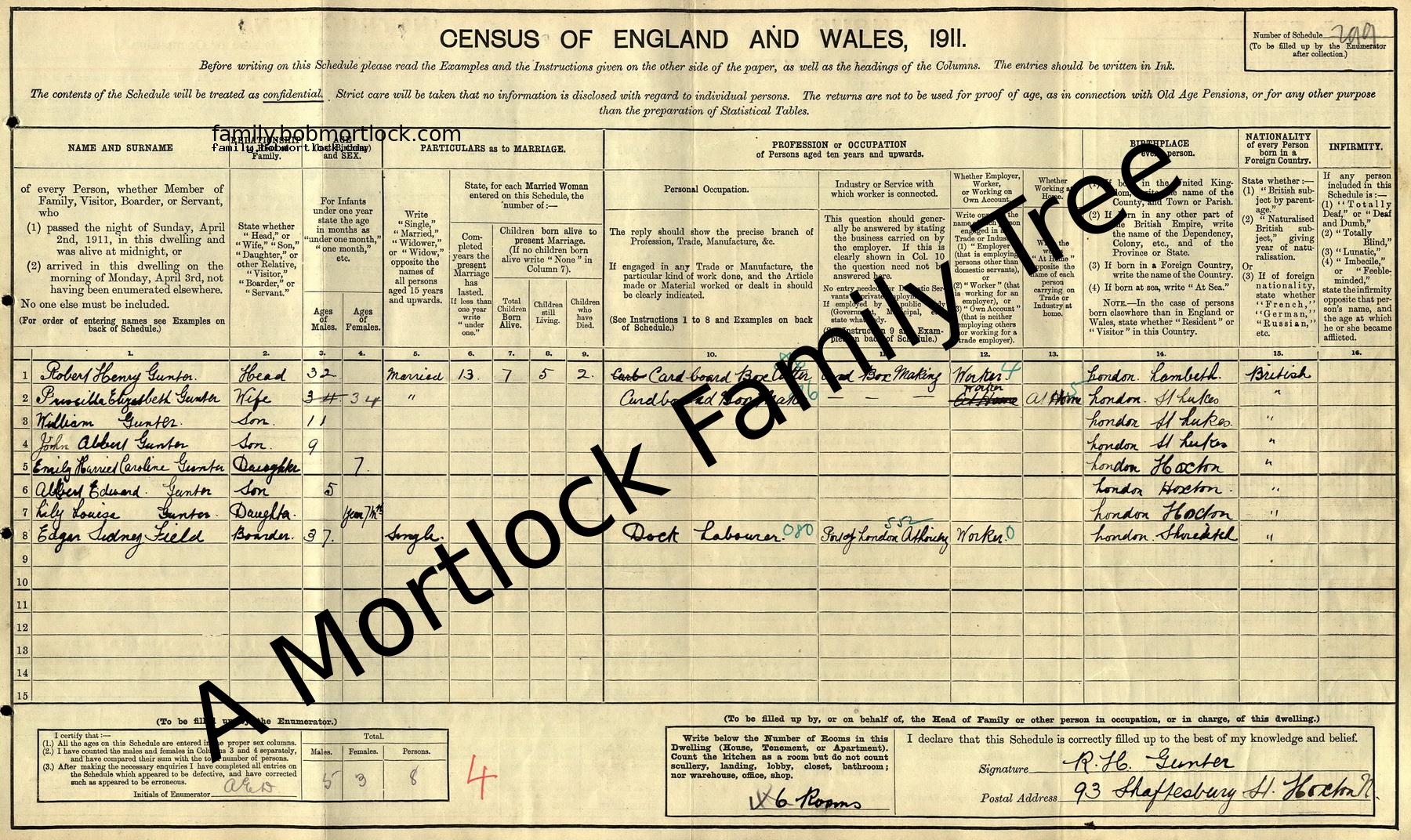 | Census | 2 April 1911 (Age 34) Shoreditch, E London, England Address: 93 Shaftesbury Street, Hoxton |