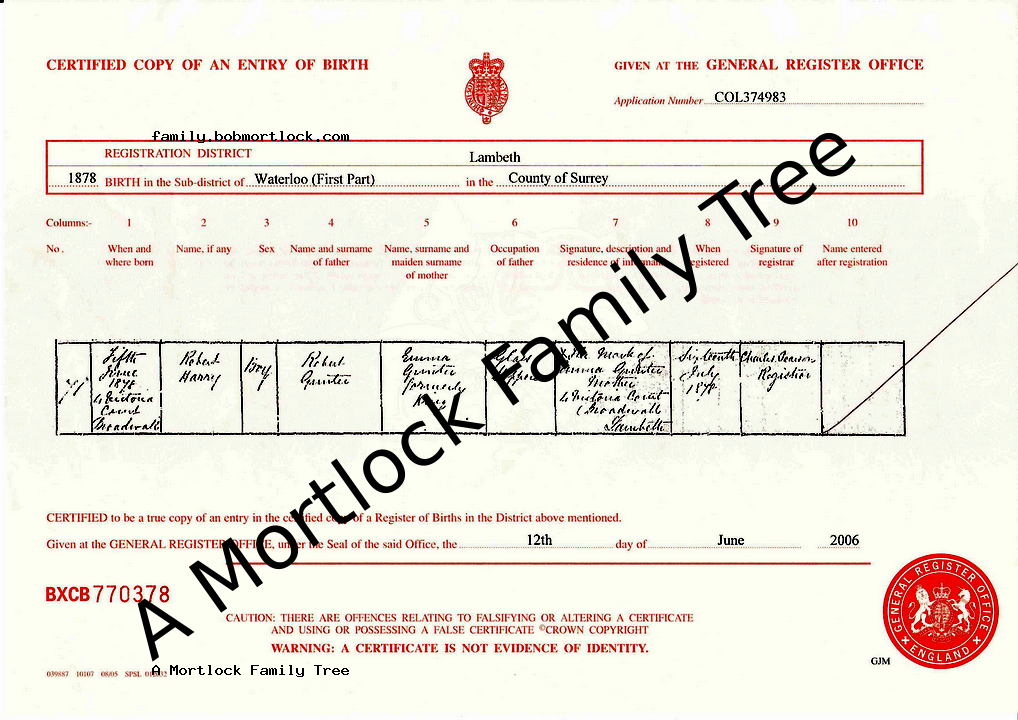 | Birth | 5 June 1878 Lambeth, S London, England Address: 4 Victoria Court |