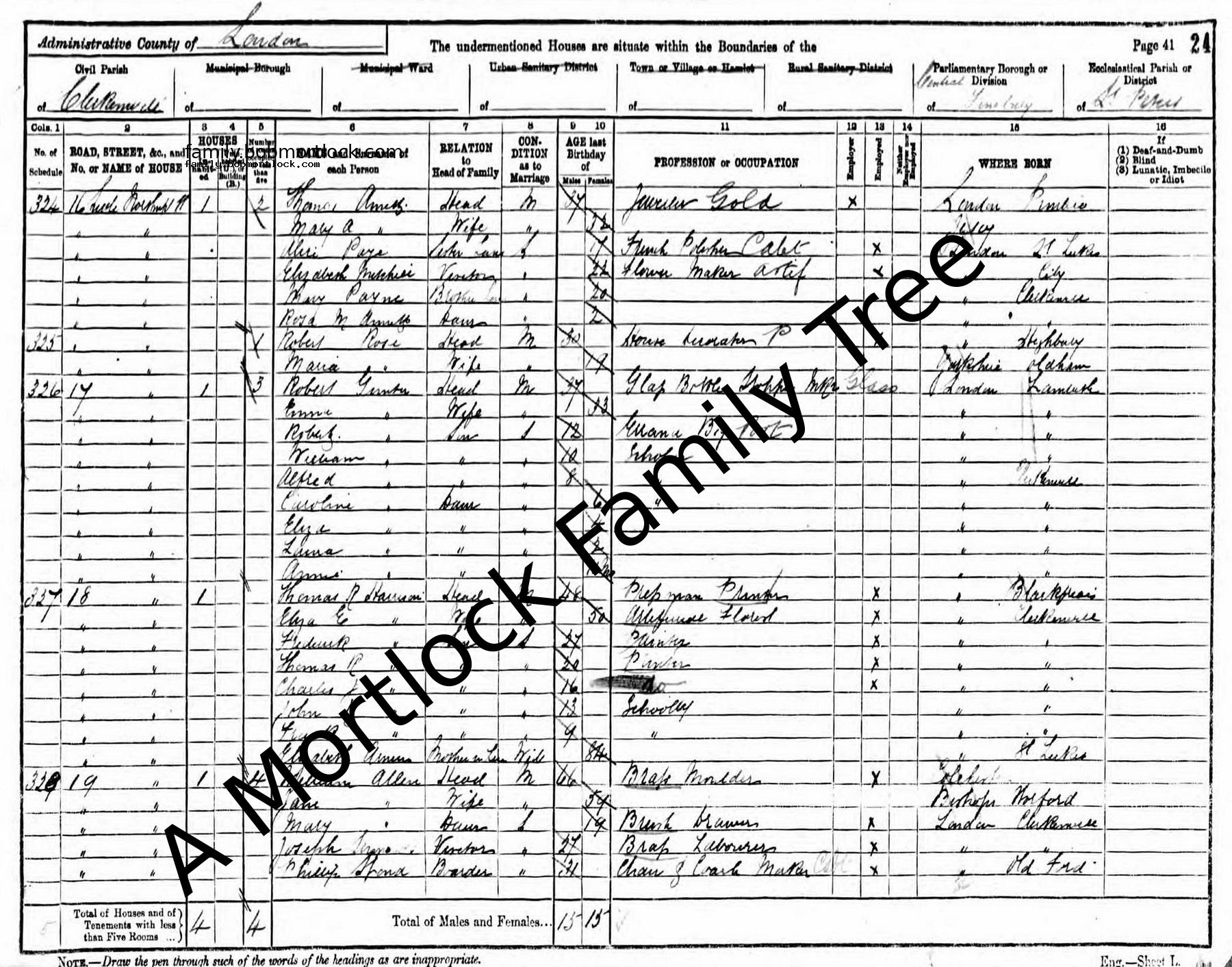 | Census | 5 April 1891 (Age 12) Clerkenwell, C London, England Address: 17 Little Northumberland Street
