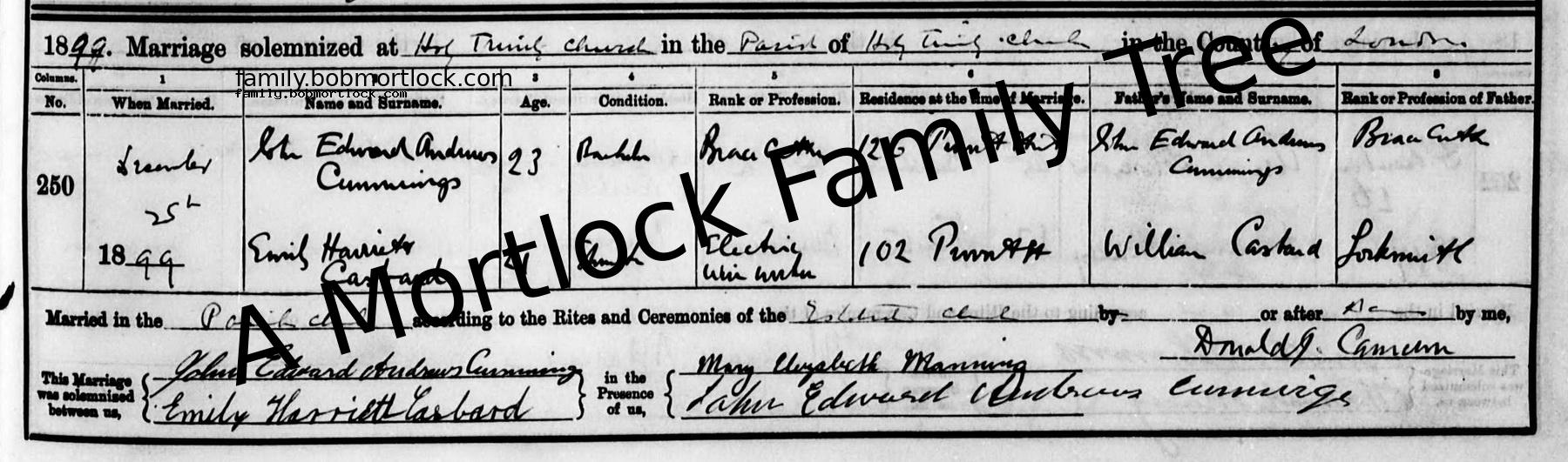 | Religious Marriage | John Edward Andrews CUMMINGS - View family 25 December 1899 (Age 20) Hoxton, E London, England Address: Holy Trinity, Bletchley Street |