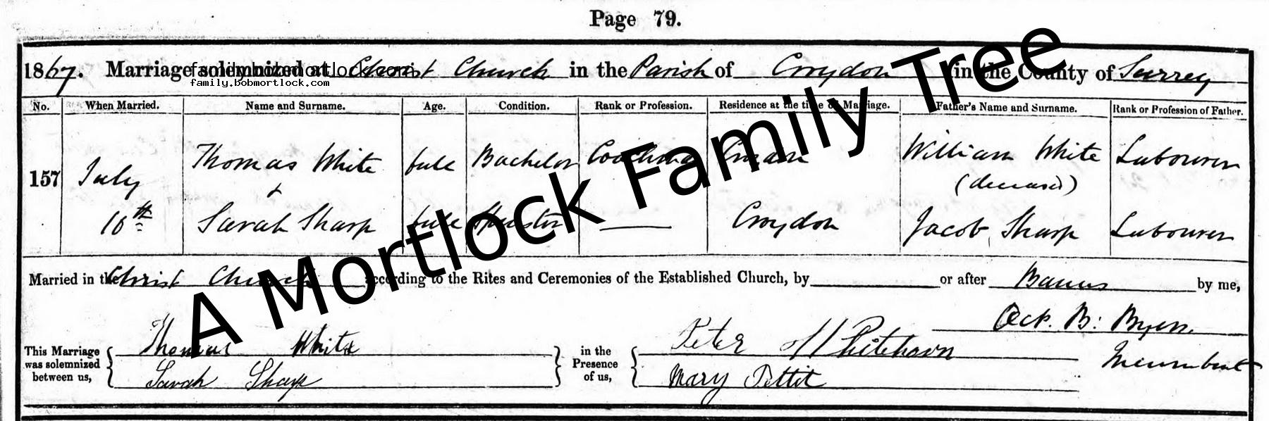| Religious Marriage | Sarah SHARPE - View family 10 July 1867 (Age 22) Croydon, Surrey, England Address: Christ Church |