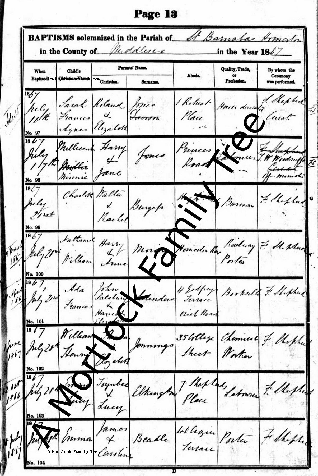 | Baptism | 21 July 1867 (Age 3 months) Homerton, E London, England Address: St Barnabus |