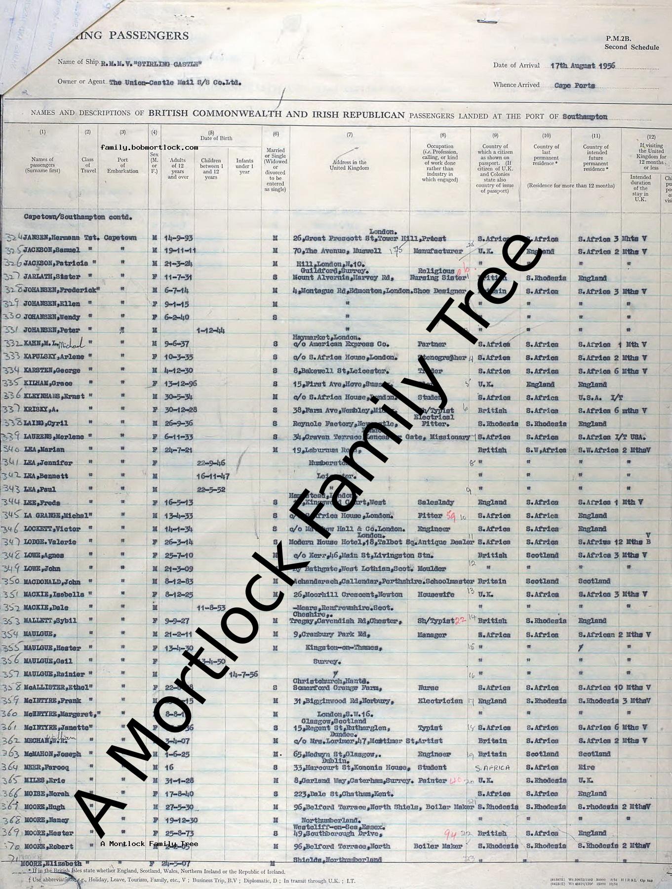 | Travel | Incomming Passenger List 17 August 1956 (Age 41) Southampton, Hampshire, England |