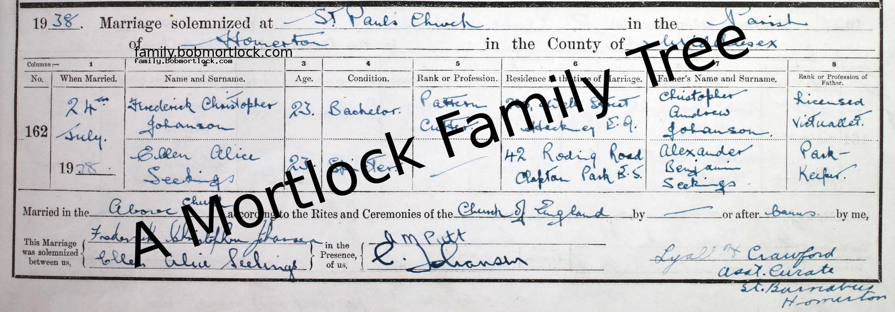 | Religious Marriage | Frederick Christopher JOHANSEN - View family 1938 (Age 22) Homerton, E London, England Address: St Paul, Glyn Road |