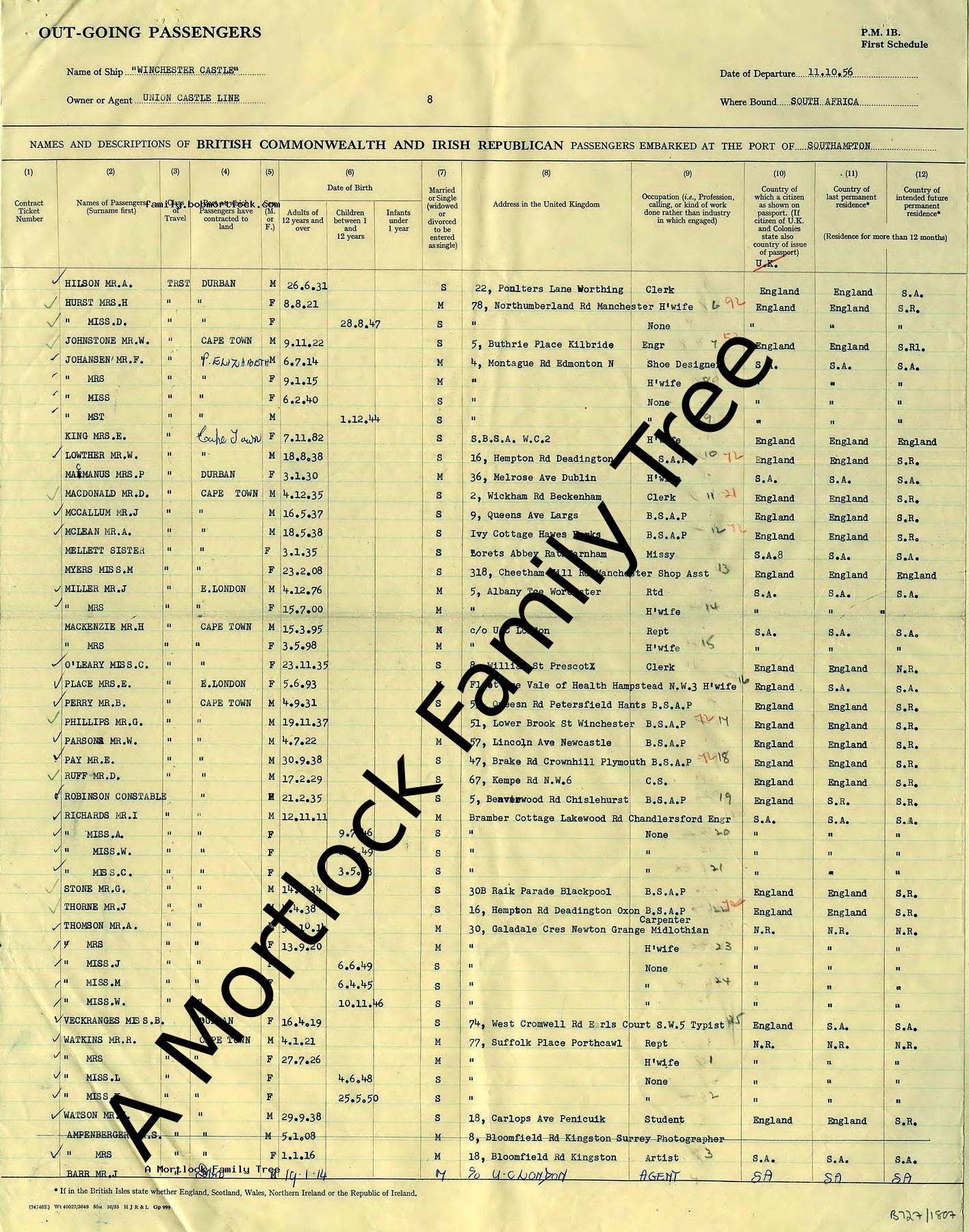 | Travel | Outgoing Passenger List 11 October 1956 (Age 41) Southampton, Hampshire, England |