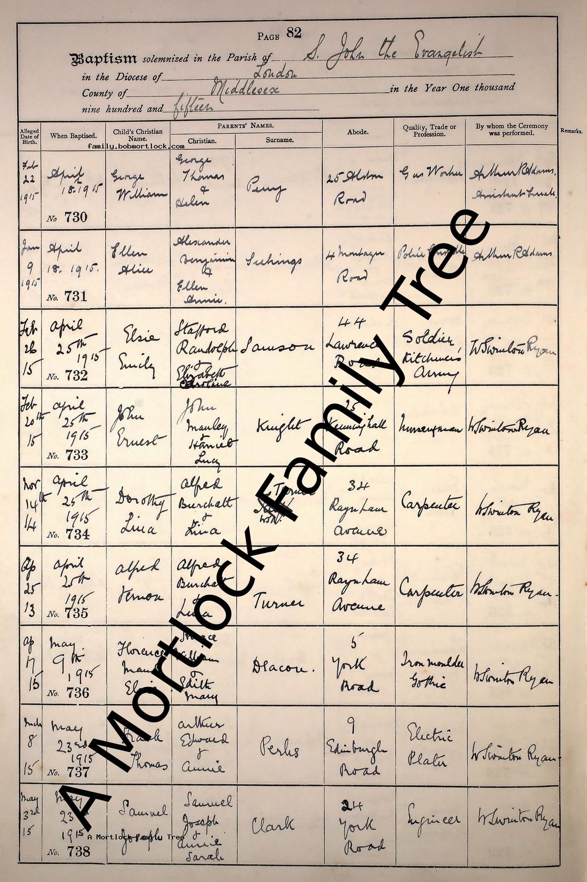 | Baptism | 18 April 1915 (Age 3 months) Upper Edmonton, Middlesex, England Address: Saint John the Evangelist, Dysons Road |