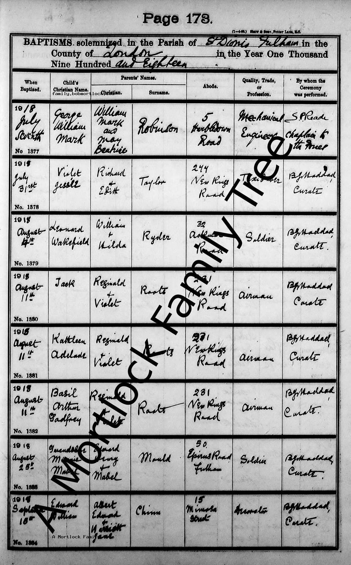 | Baptism | 31 July 1918 (Age 14 days) Fulham, W London, England Address: Saint Dionis, Parsons Green |
