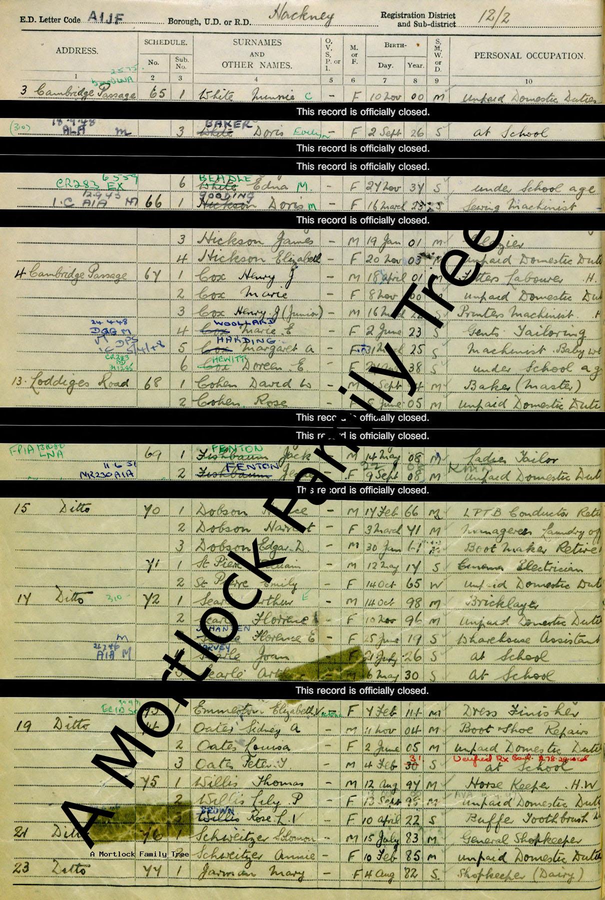 | Census | 29 September 1939 (Age 20) Hackney, E London, England Address: 17 Loddiges Road