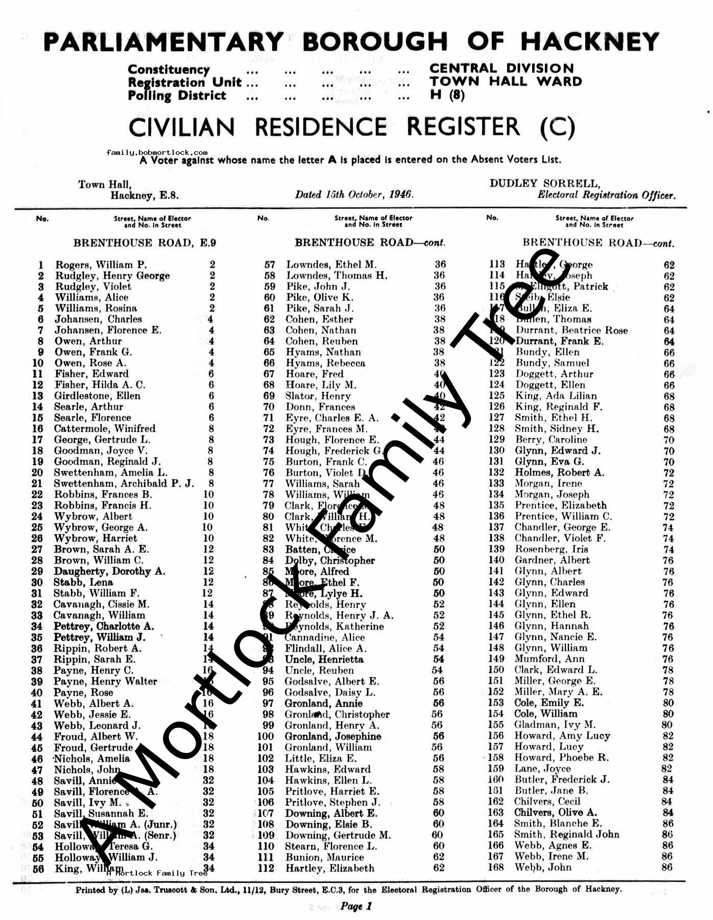 | Residence | 1946 (Age 26) Hackney, E London, England Address: 4 Brenthouse Road |