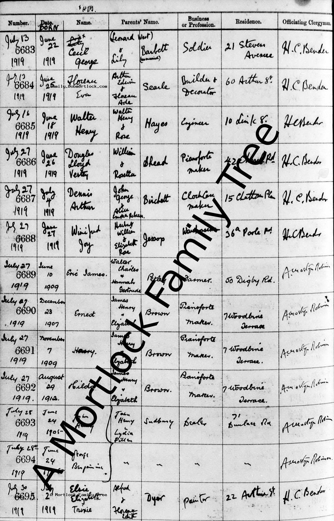 | Baptism | 13 July 1919 (Age 18 days) Hackney, E London, England Address: St Lukes |
