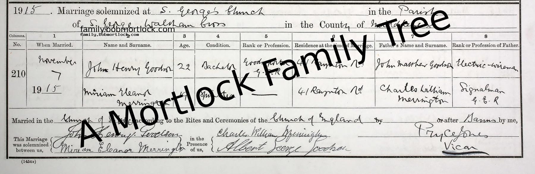 | Religious Marriage | John Henry GOODSON - View family 7 November 1915 (Age 19) Waltham Cross, Middlesex, England Address: St George's Church |