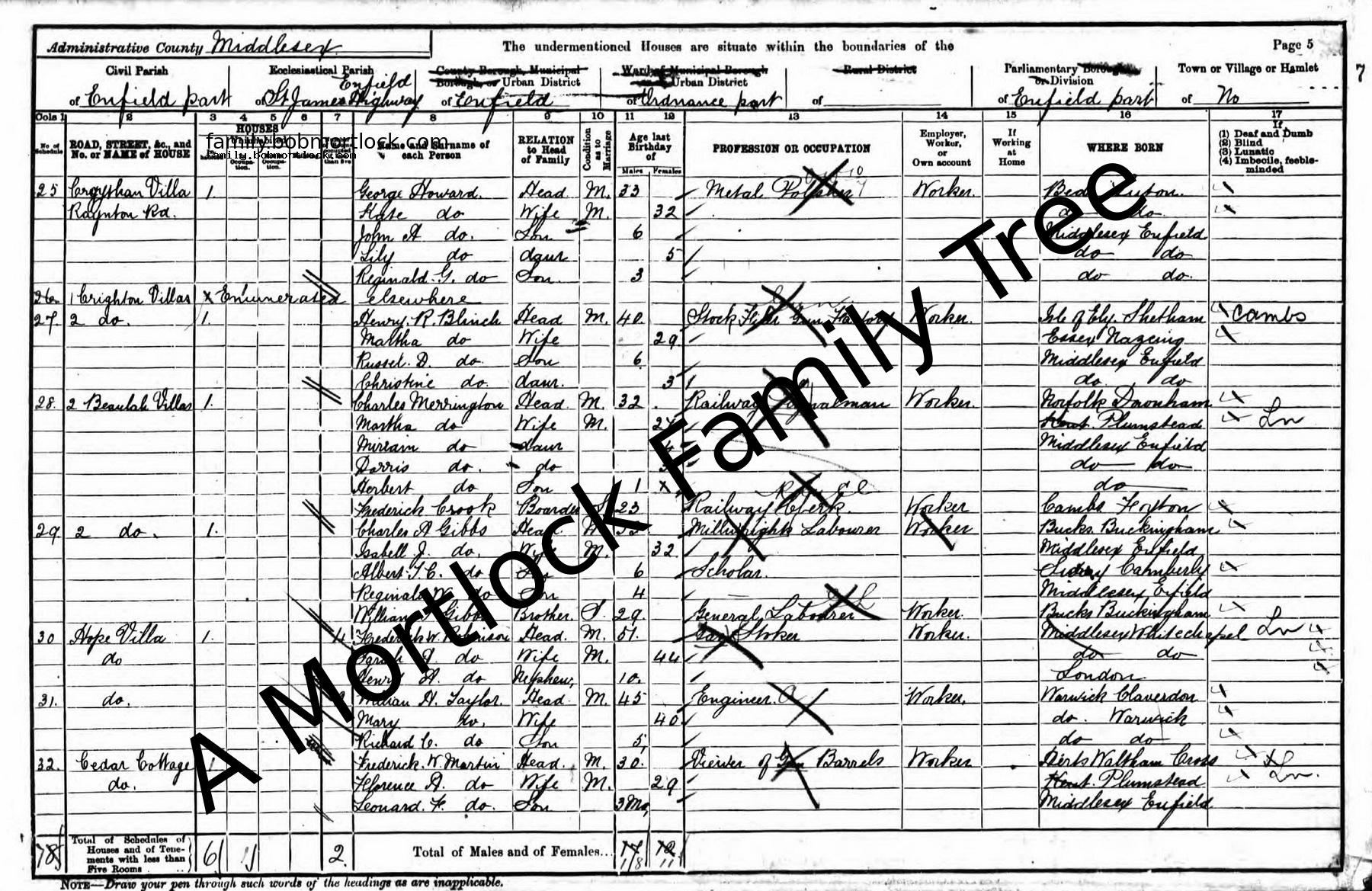 | Census | 31 March 1901 (Age 4) Enfield, Middlesex, England Address: Beaulah Villa, Rayton Road, Enfield Lock